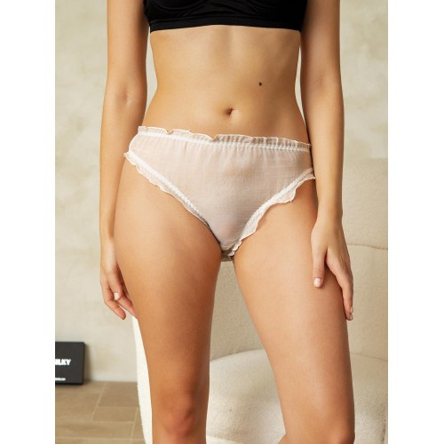 Model Wear: S. Measurement: Fabric Tips: 100% Mulberry Silk.No harmful substances. Pure silk fabric with delicate ruffle trim for a feminine touch. Classic bikini silhouette with a comfortable stretch waistband. Lightweight. breathable. and silky-soft for everyday wear and special moments. Details: Sheer pure silk panties with delicate ruffle edges. offering a lightweight.breathable. and luxuriously soft feel against the skin.
